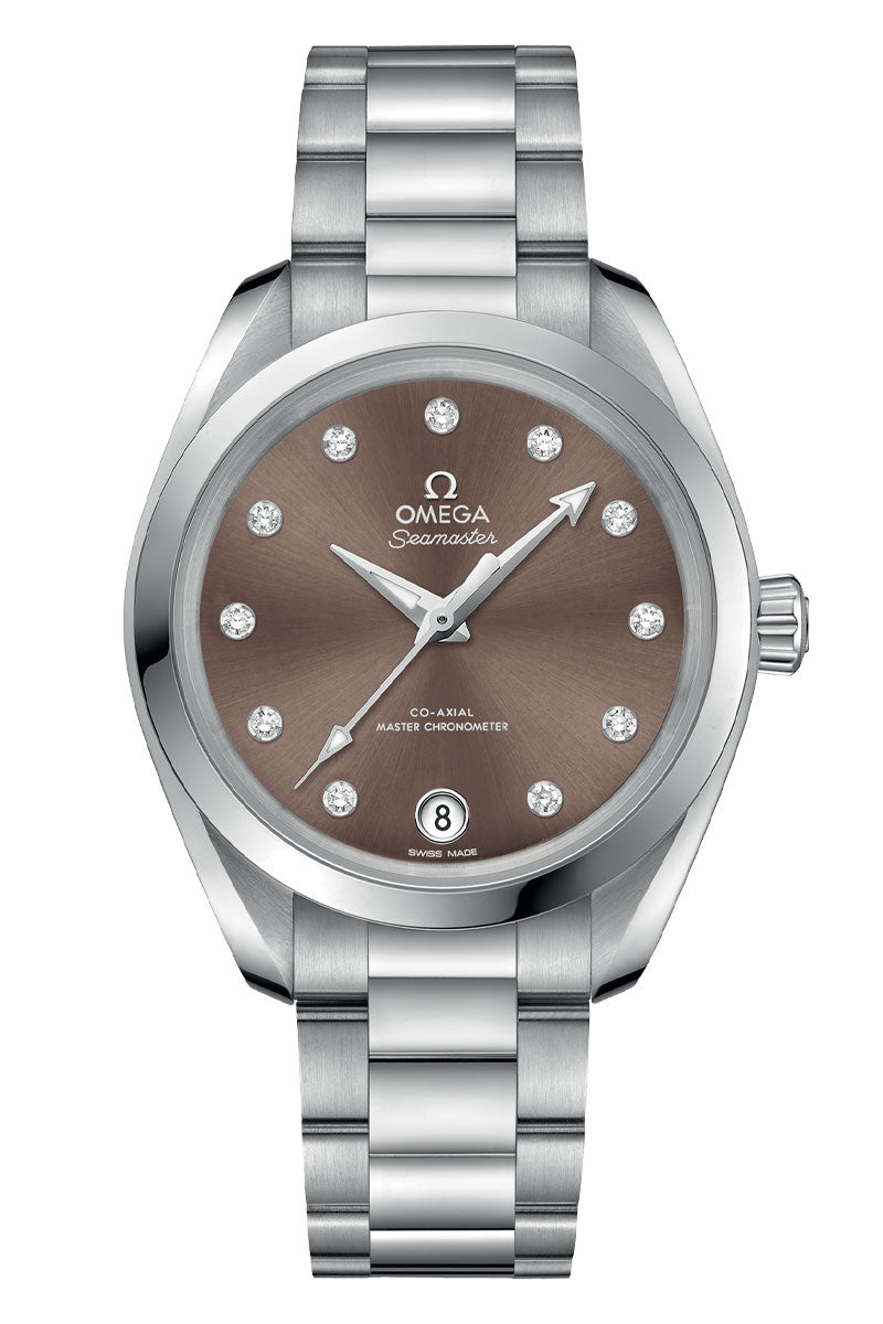With a symmetrical 34 mm case, this stainless steel model features a shimmer chestnut dial with a date window at 6 o’clock and 11 diamond indexes in rhodium-plated holders.