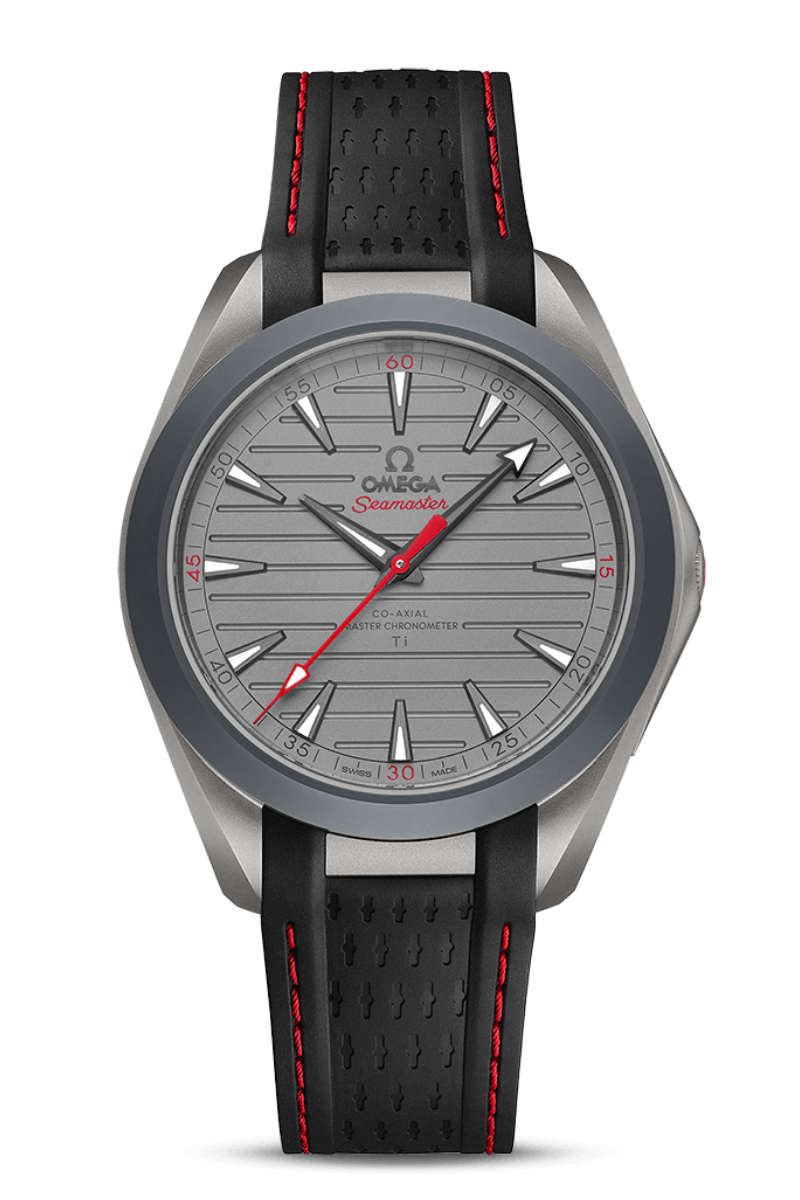 This 41 mm Aqua Terra makes bold use of red on the aluminium seconds hand, Seamaster logo, quarter hour markers and strap stitching. The watch is powered by the Omega Co-Axial Master Chronometer Calibre 8928 Ti, the brand's first movement built from titanium.