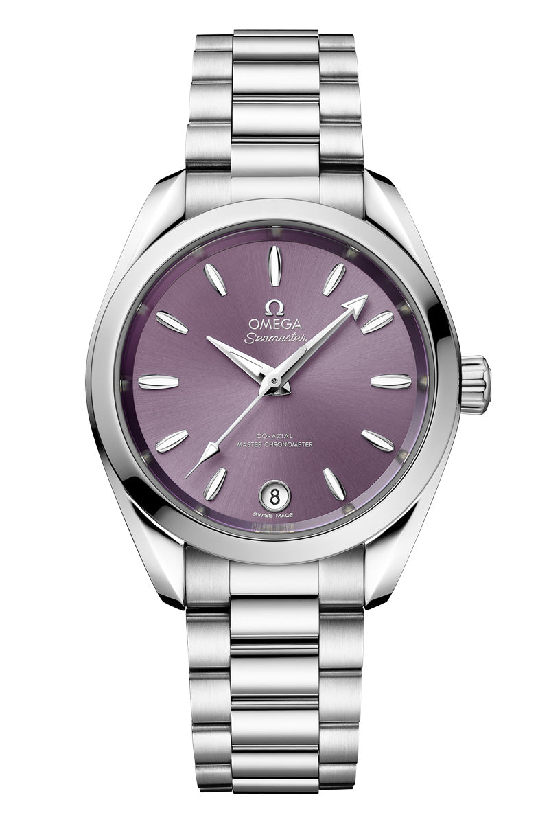 The lavender dial, fashioned from brass, is lacquered and sun-brushed from the centre. The date window at 6 o'clock, hands, indexes and OMEGA logo are in diamond-polished 18K white gold.