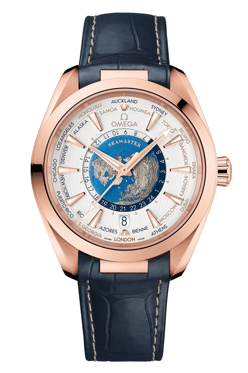 This 43 mm Worldtimer model includes a polished case in 18K Sedna™ gold, which is integrated with the blue leather strap via a solid polished gold link. 18K Sedna™ gold is also used for the hands and indexes.