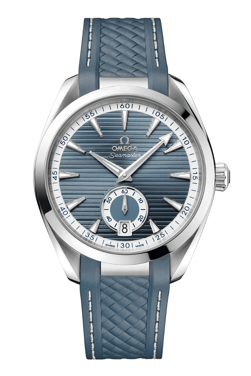 The dial is distinguished by a horizontal “teak” pattern which is inspired by the wooden decks of luxury sailboats. There is also a date window at 6 o'clock and blued hands and indexes filled with white Super-LumiNova. New for the long-running Aqua Terra line, a 'small seconds' complication changes up the dial presentation, creating a dynamic new layout inspired by classic mid-century sports watches.