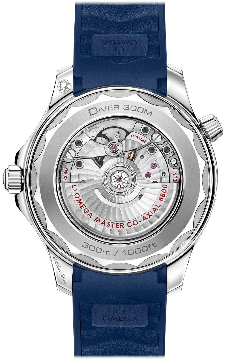 The watch is presented on a blue rubber strap and is driven by the OMEGA Master Chronometer Calibre 8800, which can be seen through the sapphire-crystal on the wave-edged caseback.