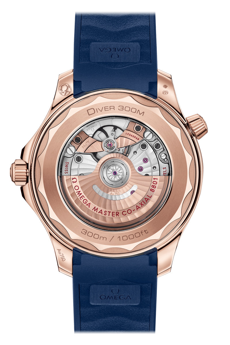 The watch is presented on a blue rubber strap and is driven by the OMEGA Master Chronometer Calibre 8801, which can be seen through the sapphire-crystal on the wave-edged caseback.