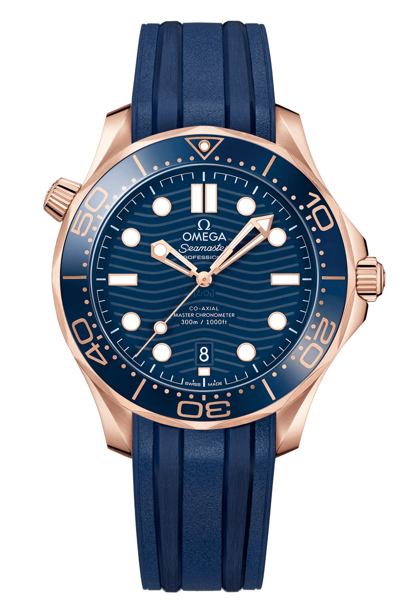 This 42 mm model is crafted from 18K Sedna™ gold and includes a polished blue ceramic bezel with a Ceragold™ diving scale. The dial is also polished blue ceramic and features laser-engraved waves and a date window at 6 o’clock.