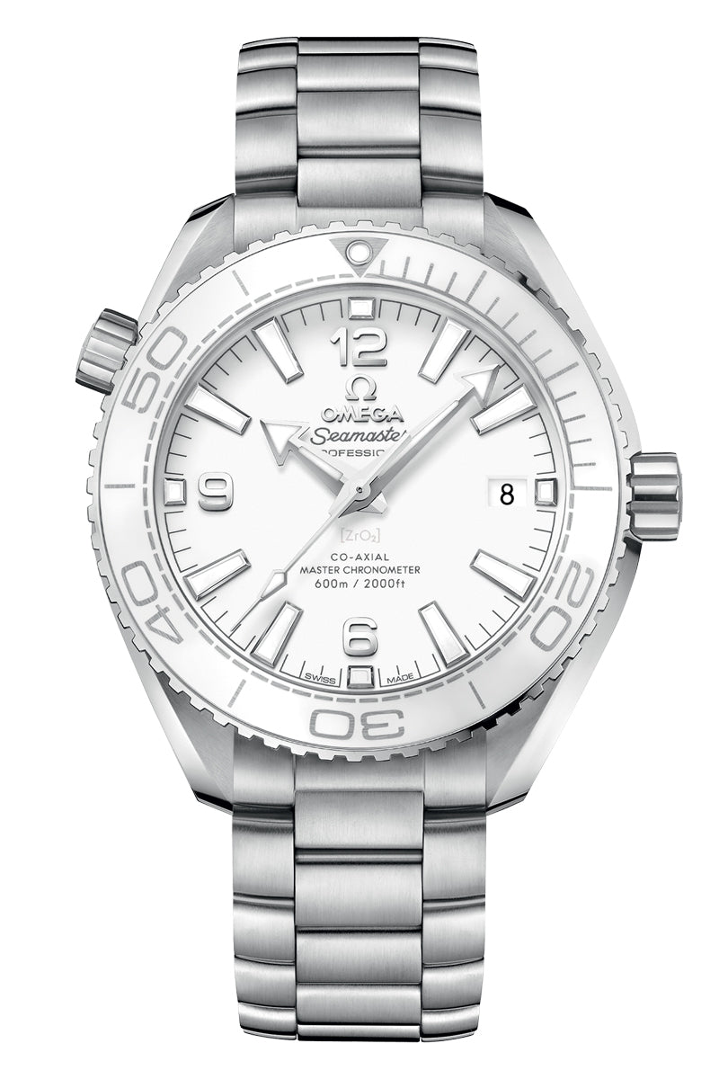 This model, with its scratch-resistant sapphire crystal, features a white ceramic dial with Arabic numerals and a date window at the 3 o’clock position. The white ceramic unidirectional bezel with OMEGA Liquidmetal™ diving scale is mounted on a 39.5 mm stainless steel case.