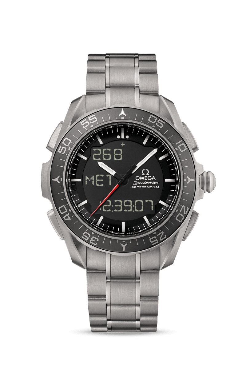 • Caliber: Omega 5620 Highly precise thermo‑compensated multi‑functional quartz movement with special functions developed and tested and qualified by the European Space Agency (ESA). It powers the Omega Speedmaster Skywalker X‑33 whose analog hands and LCD windows display, among other values: three different time zones, chronograph, timer, MET (Mission Elapsed Time), PET (Phase Elapsed Time), three alarms and perpetual calendar.