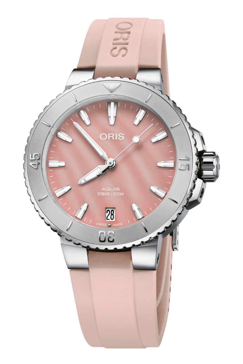 The classically modern, tapered silhouette of the Aquis Date forms the architecture for this colorful new dive watch, characterized by its delicately textured mother-of-pearl dial, whose playful pastel tones match the integrated rubber strap while echoing the shimmering surface of the sea at sunset. And sized in a 36.5mm stainless steel case, it's an elegant, sophisticated twist on the Aquis' rugged, markedly capable origins. This Aquis is powered by the Oris Calibre 733, a hard-working automatic movement with a date aperture at 6:00 and a power reserve of 38 hours.