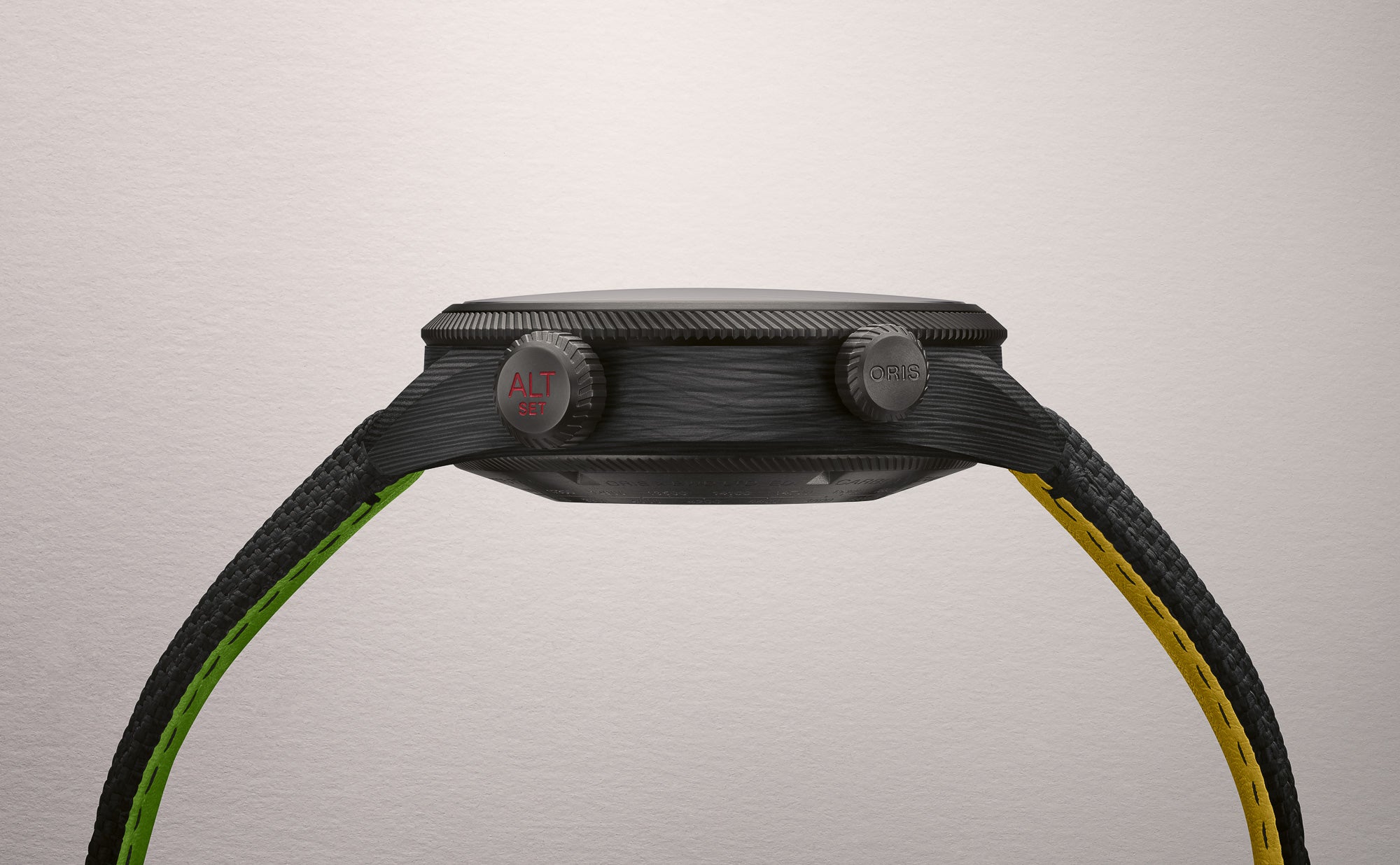 Flying higher, while sitting slimmer and lighter on the wrist, the Oris ProPilot Altimeter has been upgraded by the watch customizer of note: British-based Bamford Watch Department. This new collaborative limited edition, dubbed ‘Mission Control’ introduces a colorful, highly luminous twist to Oris' ultralight 3D-printed carbon fiber Altimeter, yielding the ultimate pilot’s watch. Underneath its super legible dial are the mechanics that make it the world’s only watch with an automatic mechanical movement and a mechanical altimeter.