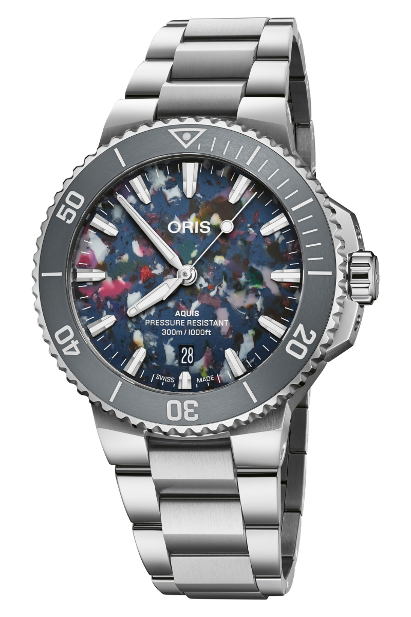 Continuing Oris' mission of Change for the Better, this Aquis is finished with a dial made entirely from upcycled plastic recovered from the ocean. The PET plastic recycling process produces random patterns, meaning no two dials are the same, making each watch a uniquely artful piece in its own right.
