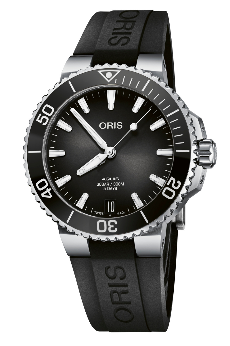 The 41.5mm case of this Aquis is also fitted with Oris' new quick-change strap system, which facilitates the easy removal and change of bracelet or strap without tools. And true form for the Aquis' purpose-built capability, this reference is water resistant to 300 meters.