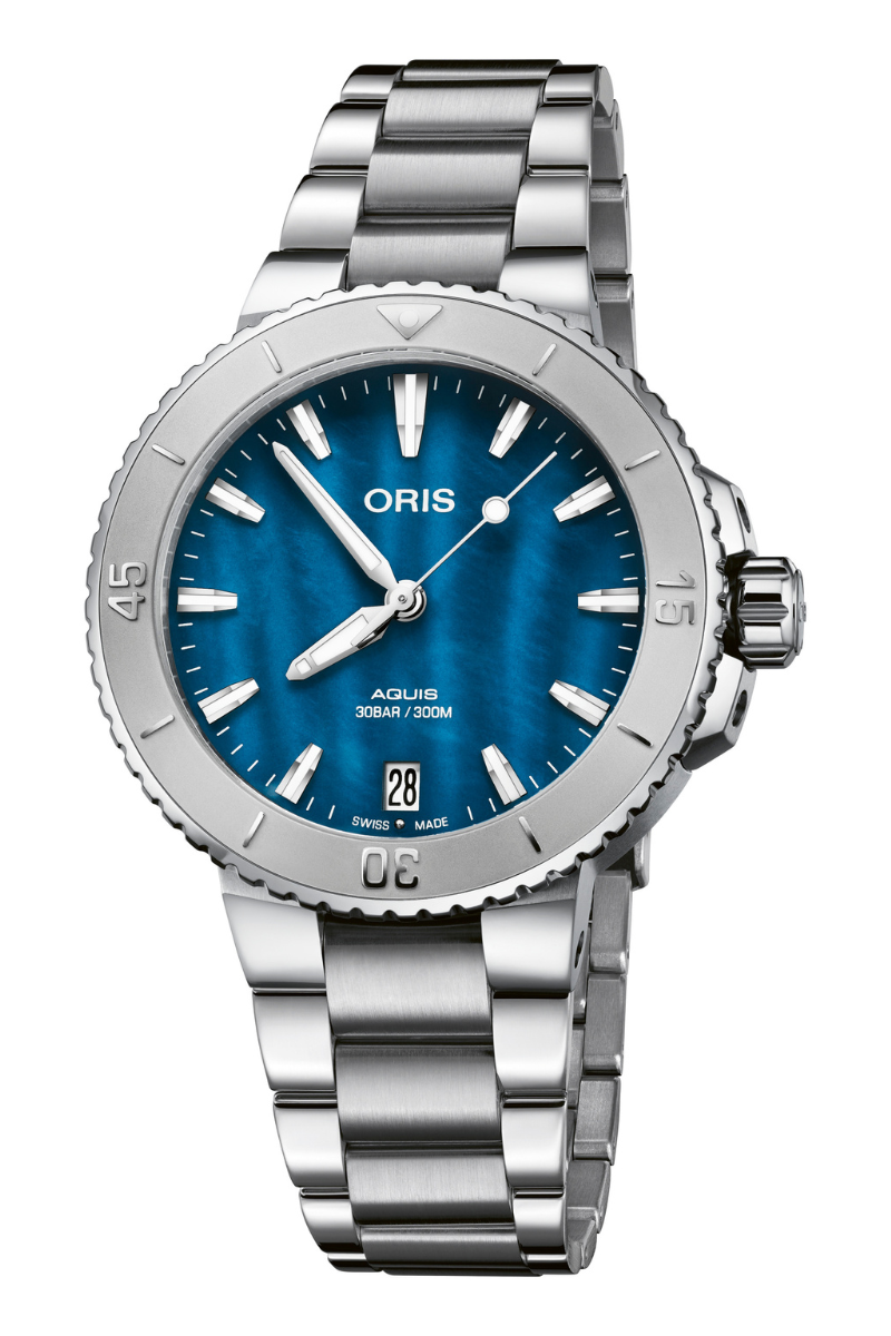 The classically modern, tapered silhouette of the Aquis Date forms the architecture for this colorful new dive watch, characterized by its delicately textured mother-of-pearl dial, whose playful pastel tones echo the shimmering surface of the sea at sunset. And sized in a 36.5mm stainless steel case, it's an elegant, sophisticated twist on the Aquis' rugged, markedly capable origins. This Aquis is powered by the Oris Calibre 733, a hard-working automatic movement with a date aperture at 6:00 and a power reserve of 38 hours.