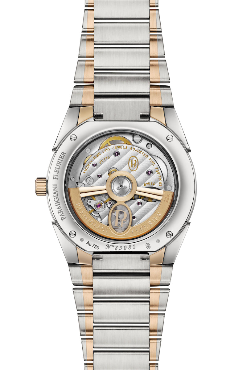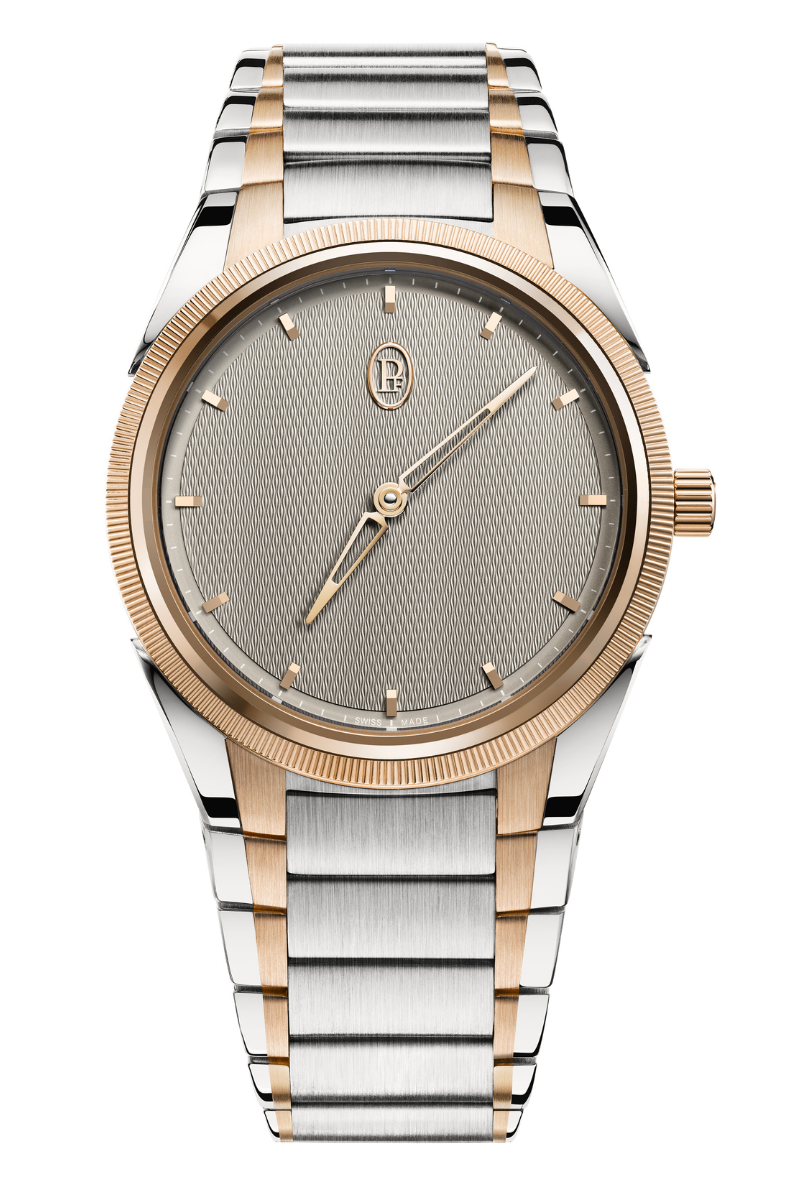 The quest for aesthetic purity is pivotal in the creative process at Parmigiani Fleurier. Given the GPHG-winning Tonda PF collection's subtle and refined spirit, the brand's first bicolor Tonda PF posed a stylistic challenge. How do you incorporate a contemporary two-tone look without jeopardising the innate discretion of this collection? The solution was to use the precious metal to magnify certain architectural traits of the case and bracelet. For example, the finely knurled bezel of the Tonda PF is recreated in 18ct rose gold, and the supple integrated bracelet features rose gold links that accentuate its tapering profile.