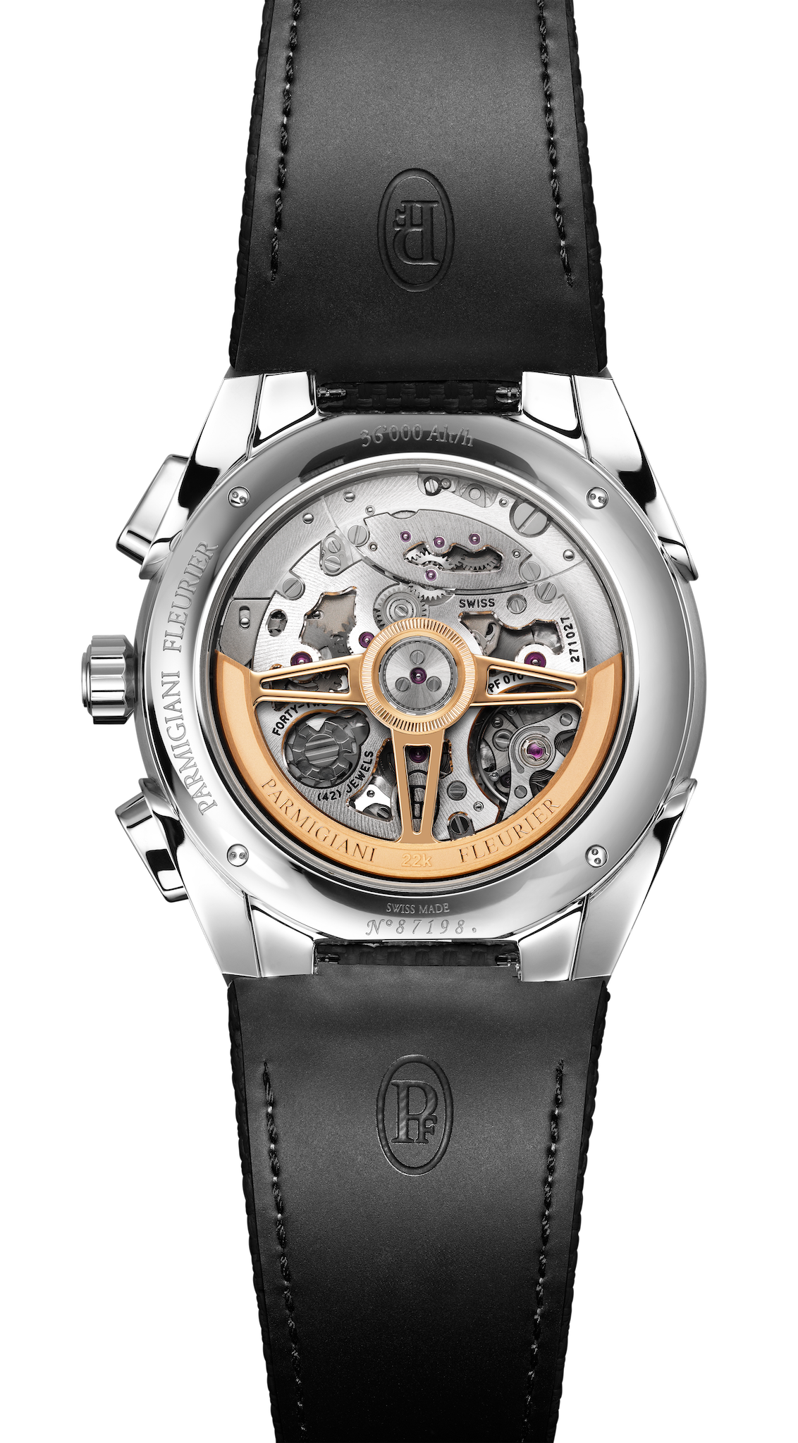 This spectacular chronograph is powered by Parmigiani's own COSC-certified PF070 caliber, an automatic manufacture movement. With a column wheel and high-beat frequency of 36,000Vph (5 Hz), it combines stunning accuracy with 65 hours of power reserve. The 22-carat rose gold skeletonized oscillating weight and satin-finished open-worked bridges with hand-beveled edges add a touch of sophistication.