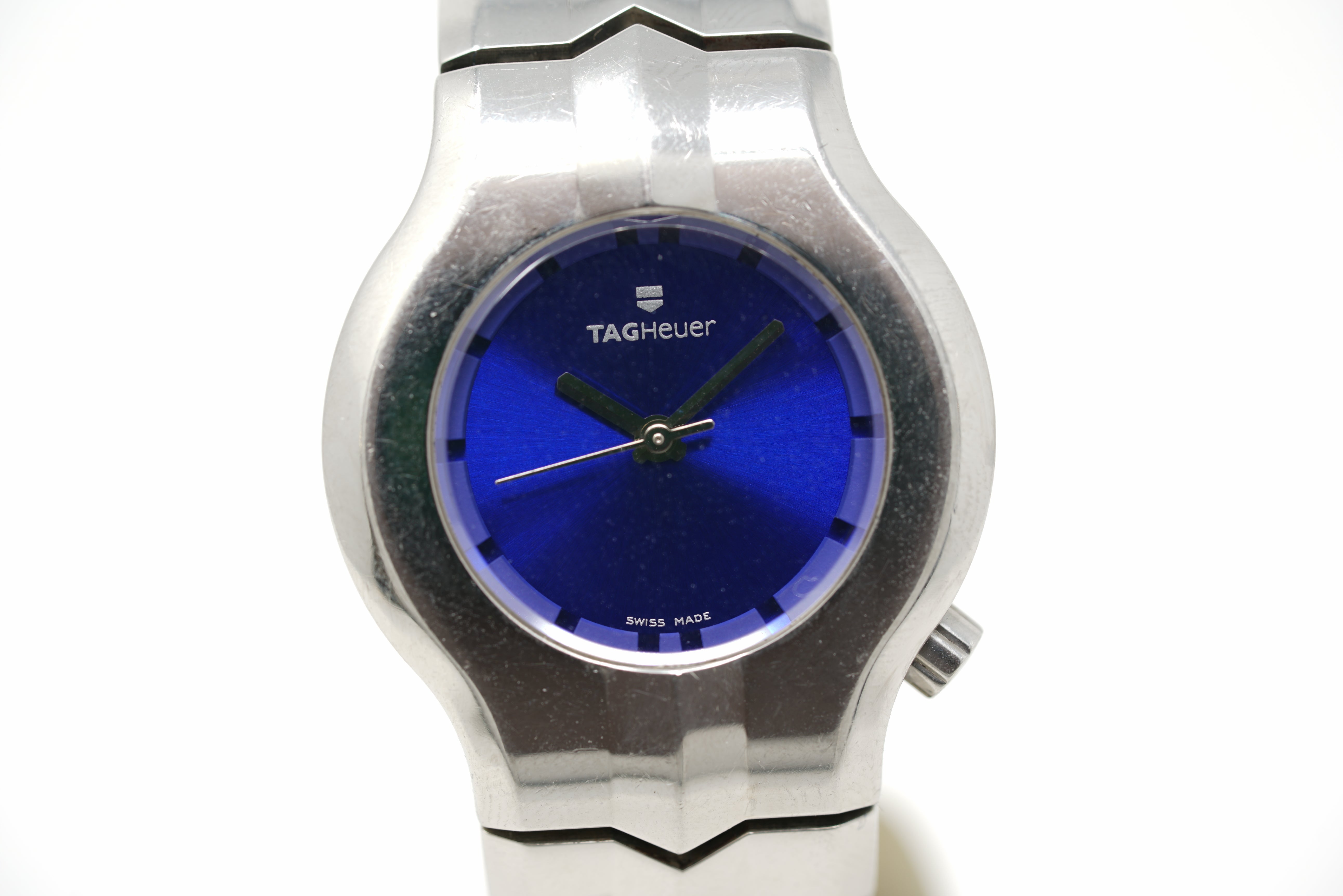 This pre-owned watch is in 77% condition due to marks on the lugs, bezel, and throughout the case. The bracelet is in 77% condition due to marks on the links and clasp. The bracelet will accommodate a wrist size of up to 7 inches. Originally purchased in October 2004, this watch comes with its inner and outer box, instruction manual, warranty card, and the one-year Topper Pre-Owned Select warranty. The original Tag Heuer inner box is in fair condition due to wear and peeling.