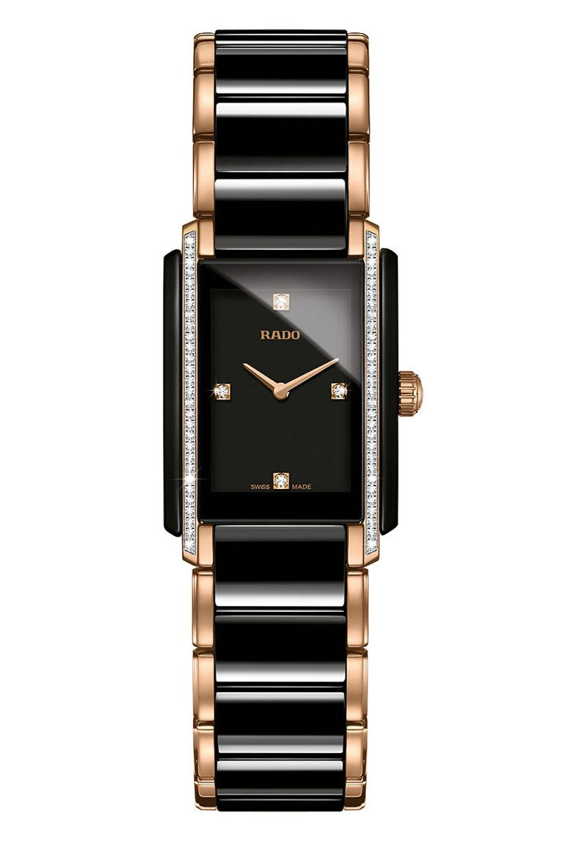 The seamless linear construction of the Rado Integral has made it an enduring classic. Crafted from high-tech ceramic and stainless steel, this model offers the purity of graphic linearity packed into a rectangular case encrusted with 58 diamonds.