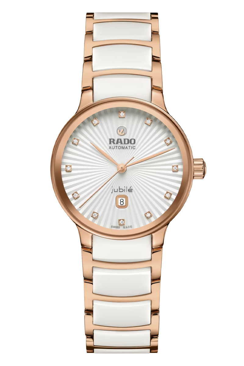 The classic Centrix Automatic Diamonds watch has been reworked not only technically, but also aesthetically. The modified model has a rounded sapphire crystal that extends all the way to the edge and a curved case blending with the curved crystal edge. The overall appearance of this iconic timepiece is completed with adjusted case lugs and a bracelet made of polished rose-gold-coloured PVD-coated stainless steel with white high-tech ceramic middle links. The silver facetted dial has an opulent 3D effect created by stamping a shaped dial and then filling it with lacquer. Inside, the three-hand calibre R582 movement exceeds standard accuracy test requirements from 3 to 5 positions, thanks to its antimagnetic Nivachron™ hairspring for increased reliability and accuracy. The watch is water resistant down to 50 m and offers 48 hours of power reserve.