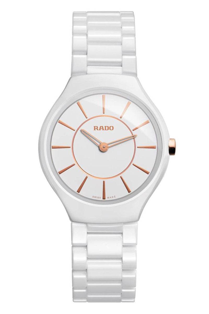 The True Thinline are Rado’s slimmest watches, the first to feature the groundbreaking monobloc case and are presented in full high-tech ceramic. With lightness, scratch resistance and wearer comfort guaranteed they are designed to stand the test of time. This ceramic white dial ladies watch is an elegant and sleek timepiece featuring a glossed white high-tech ceramic case and a white analog dial.