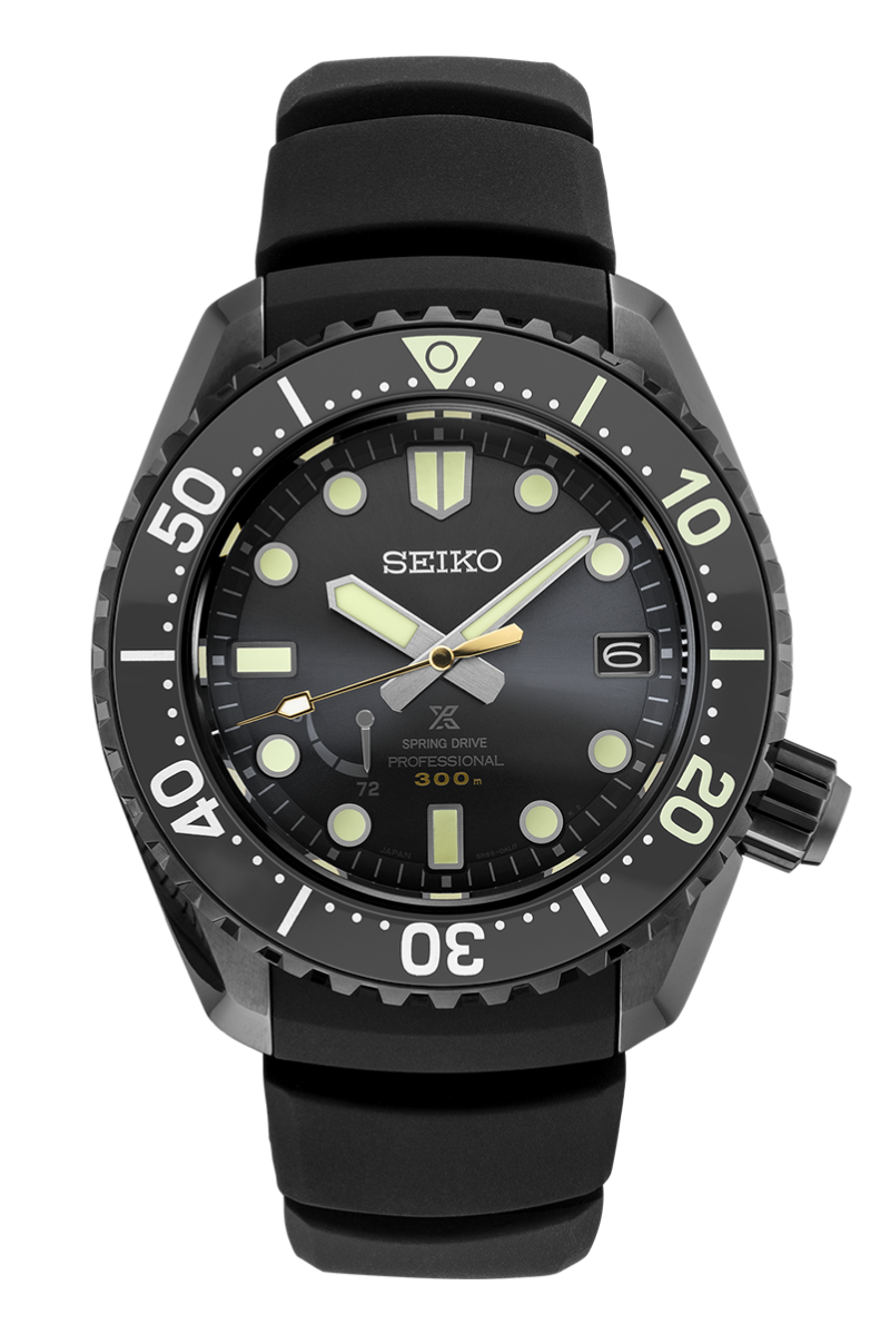Designed for those who treat life as the ultimate adventure, the Seiko Prospex line follows every challenge with technological excellence and style. Available only in a limited edition of 200 pieces, with the serial number engraved on each caseback, this saturation diver, meeting ISO standards for scuba diving to depths of up to 300 meters, features a bezel crafted of Cermet, a proprietary Seiko material offering the hardness of ceramic with the finish, appearance and shine of metal. Eight times harder than steel, Cermet provides enhanced shock protection. Powered by a Seiko Spring Drive movement, this precision watch combines a 30-jewel mechanically driven movement with a quartz regulator for accuracy to +/- 1 second per day, +/- 15 seconds per month. With a power reserve of approximately 72 hours, the movement can be wound manually or automatically. Crafted of light and durable titanium with a black super-hard coating for nearly doubled hardness, this superbly reliable watch features a screwdown caseback and crown, as well as a black silicone strap. The dark gray dial, topped by a curved sapphire crystal with anti-reflective coating on its inner surface, includes a power reserve indicator, date calendar, and LumiBrite hands and markers, and is framed by a unidirectional Cermet bezel in a dark platinum shade to suggest the sea surface in moonlight. Limited edition of 200 pieces