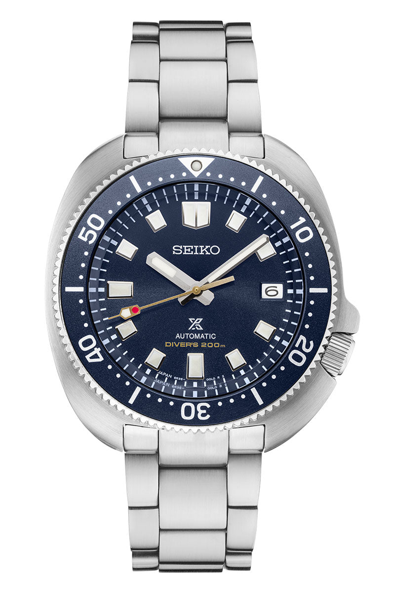 This reference SPB183 continues a celebration of the 55th Anniversary of Seiko's first diver's watch with a reimagining of the famed 1970 model, complete with the iconic case design that revolutionized underwater safety with a recessed crown creating a built-in crown guard at 4 o'clock. With contemporary styling and technology, this masterfully updated design, sleeker and slimmer than the original, is crafted of stainless steel with super-hard coating, and includes a curved anti-reflective sapphire crystal, blue one-way rotating elapsed timing bezel, screwdown crown and caseback, and tri-fold push button release clasp with secure lock and extender, as well as an additional blue-gray silicone strap. The rich marine blue dial features a date calendar and LumiBrite hands and markers. Following ISO standards for scuba diving to depths of up to 200 meters, this exceptional watch can be wound manually or automatically and includes a 24-jewel automatic movement with a frequency of 21,600 vibrations per hour and a power reserve of approximately 70 hours.