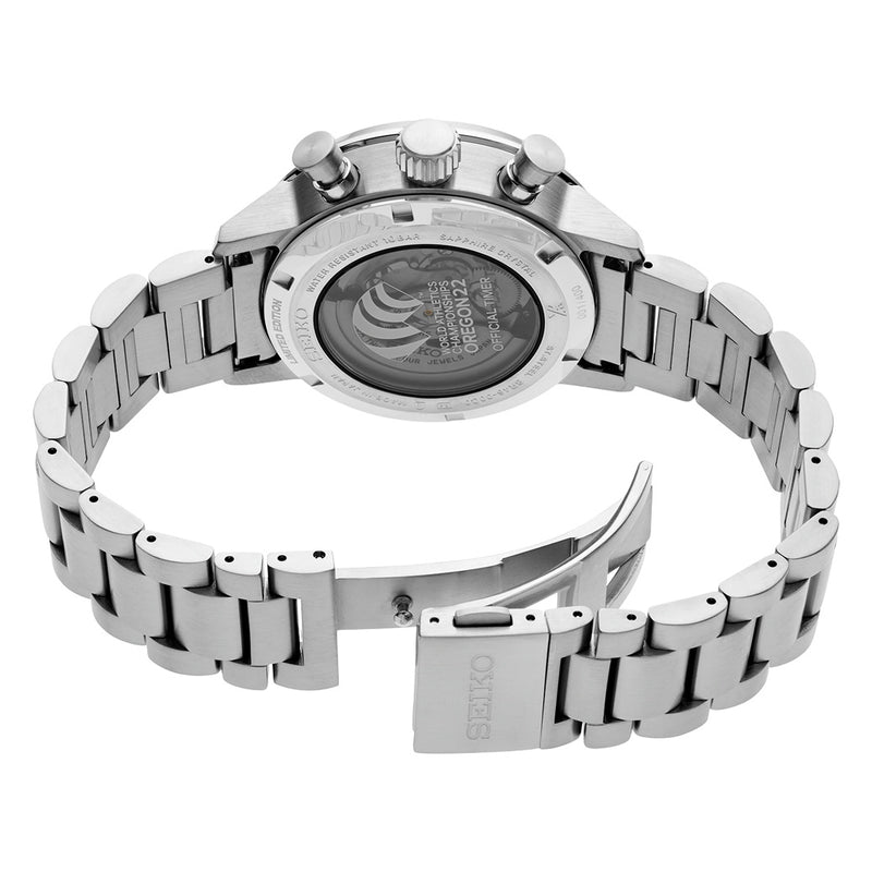 Designed for those who treat life as the ultimate adventure, the Seiko Prospex line meets every challenge with technological excellence and style. Celebrating Seiko's first precision chronographs, developed for international sporting competitions in 1964, as well as its 1969 introduction of the world's first automatic chronograph, this exceptional watch provides chronograph measurement of up to 30 minutes of elapsed time in 1/8-second increments. Produced in a limited edition of 400 for the World Athletics Championship, with a special embossed logo for the competition and the serial number engraved on each caseback to show its place in a controlled-production run, this unique design features a low-reflection black dial patterned to recall the running track at the legendary Hayward Field, site of WCH Oregon 22. The contrasting subdials, LumiBrite hands and markers, and yellow chronograph hand provide enhanced legibility. Visible through the screwdown, see-through caseback, the 34-jewel automatic movement beats at a frequency of 28,800 vibrations per hour, with a power reserve of approximately 45 hours and manual winding capability. The proprietary 8R46 movement includes a column wheel and vertical clutch mechanism allowing for smooth, stutter-free movement of the chronograph hand while providing longer wear and efficiency, and improving maintenance of the power reserve during chronograph operation. Crafted of stainless steel with super-hard coating, specially designed pushers and crown for ease of use, tri-fold push button release clasp, and dual curved sapphire crystal with anti-reflective coating on the inner surface, this extraordinary timepiece also includes an additional black leather strap, and is packaged in a Limited Edition collectors' box. 10 bar, 100M Water Resistant