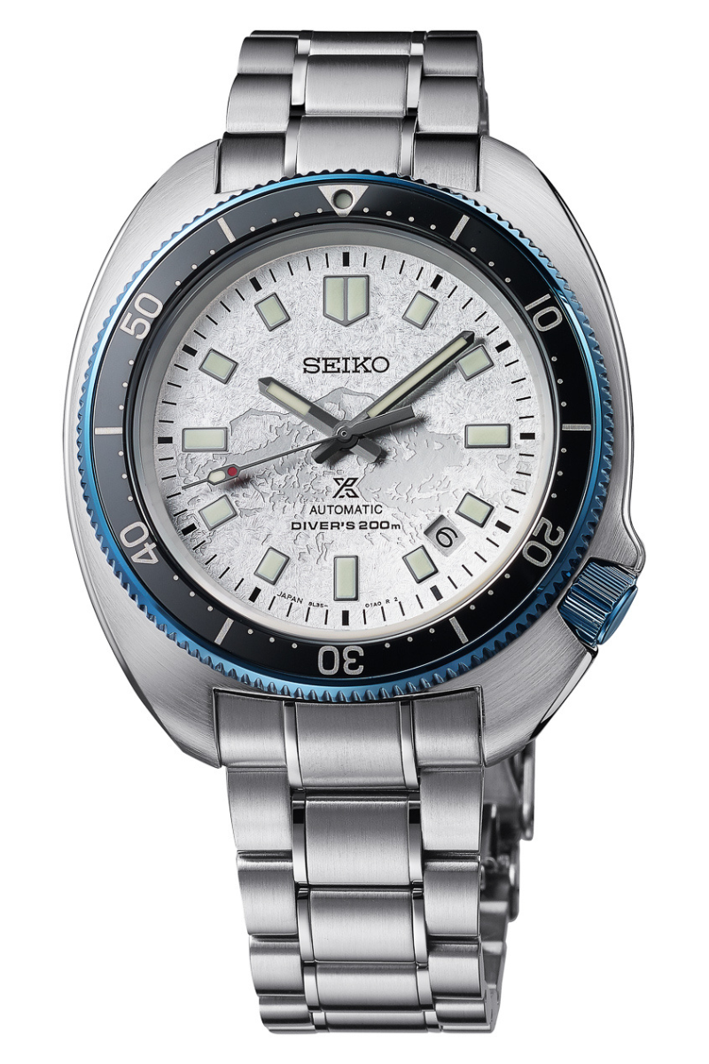 Uemura’s ascents of these five mountains are commemorated with this new reference SLA069, a modern re-interpretation of the 1970 diver’s watch whose dial depicts Mont Blanc, the first of these climbs, which he summited at the age of 25.
