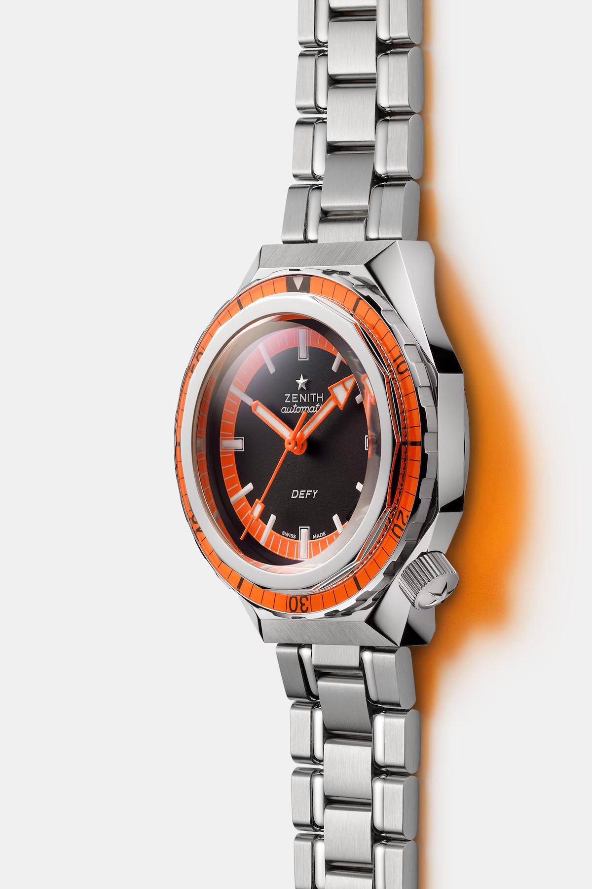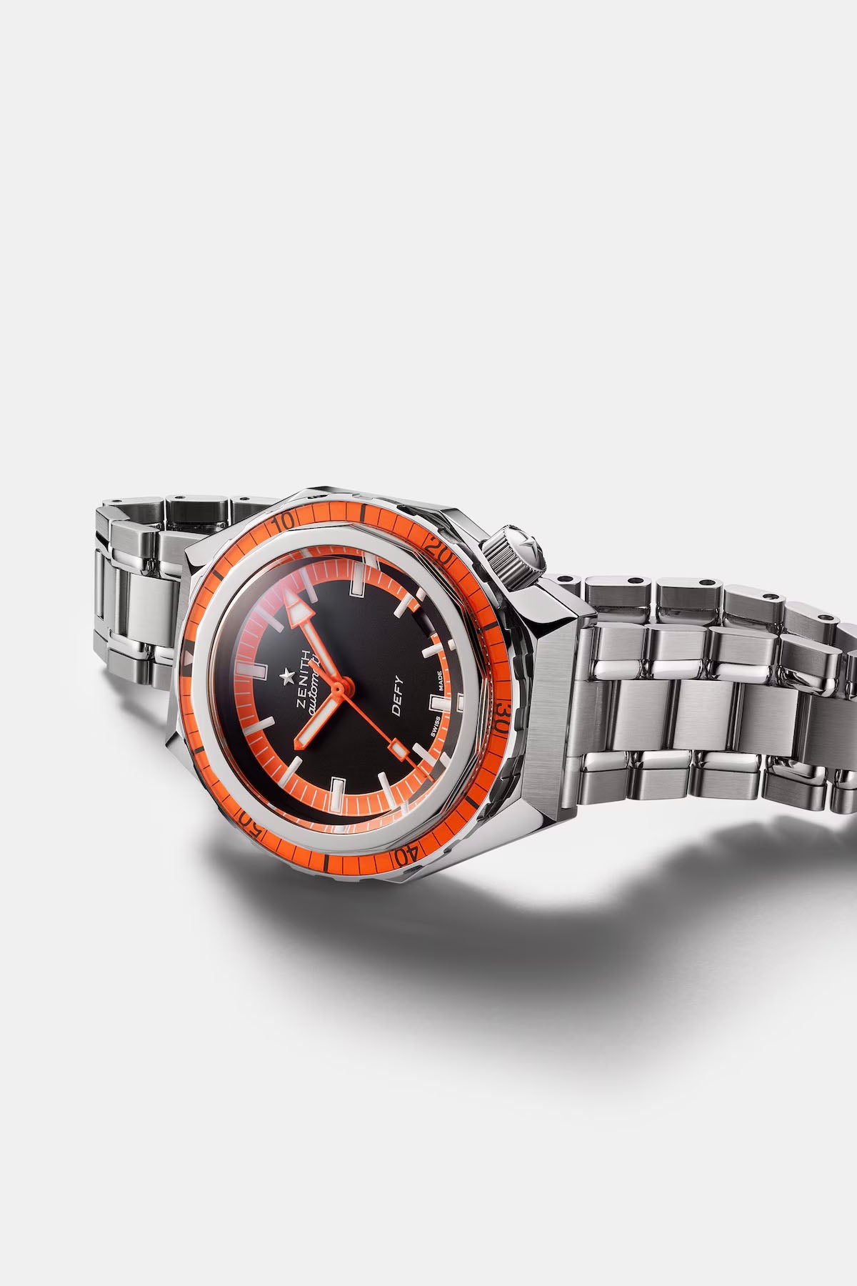 In this debut example of a revival diver’s watch, Zenith resurrects one of its most emblematic models with the Defy Revival A3648. Launched in 1969, the A3648 had a water resistance of 60 ATM, a considerable feat for such a compact timepiece. Powered by the Elite 670 automatic movement, the stainless-steel case features a unidirectional, rotating bezel with a sapphire-crystal insert and iconic, contrasting black and orange hands and dial. This covetable collectible comes on a five-link steel bracelet, modelled after the bracelet originally designed by the famed Gay Frères company for the historic reference in 1969.