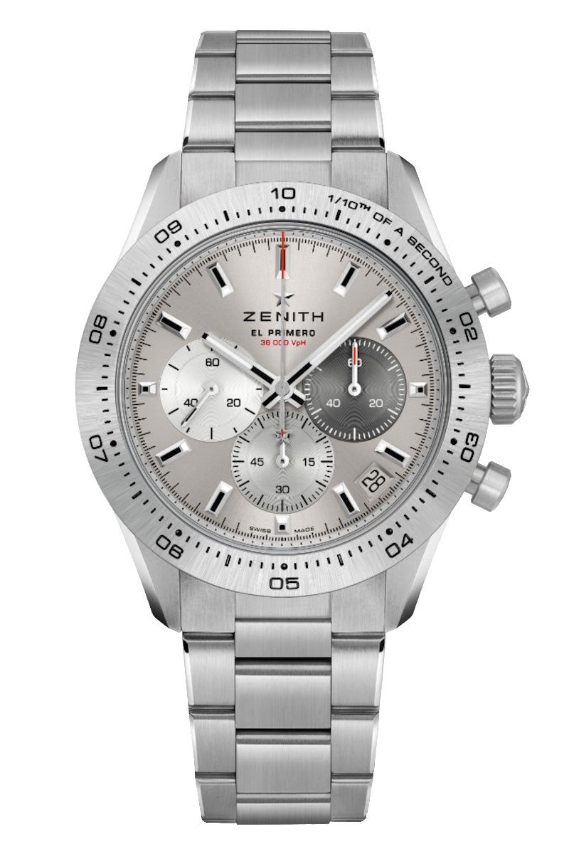 More than just a watch, this sleek and sporty titanium Zenith Chronomaster Sport is a symbol of the relationship between utility and time. Weighing 30% less than its steel cousin, this hard-wearing watch pushes the boundaries of timekeeping and sports performance, ensuring unhindered freedom of movement. A showstopper in every way, the 41-mm case has been given a silky, polished finish while the grey sunburst dial reinterprets Zenith's signature tricolour design. Inside, an iconic star-shaped oscillating weight reminds us to reach for our dreams and make every moment count.