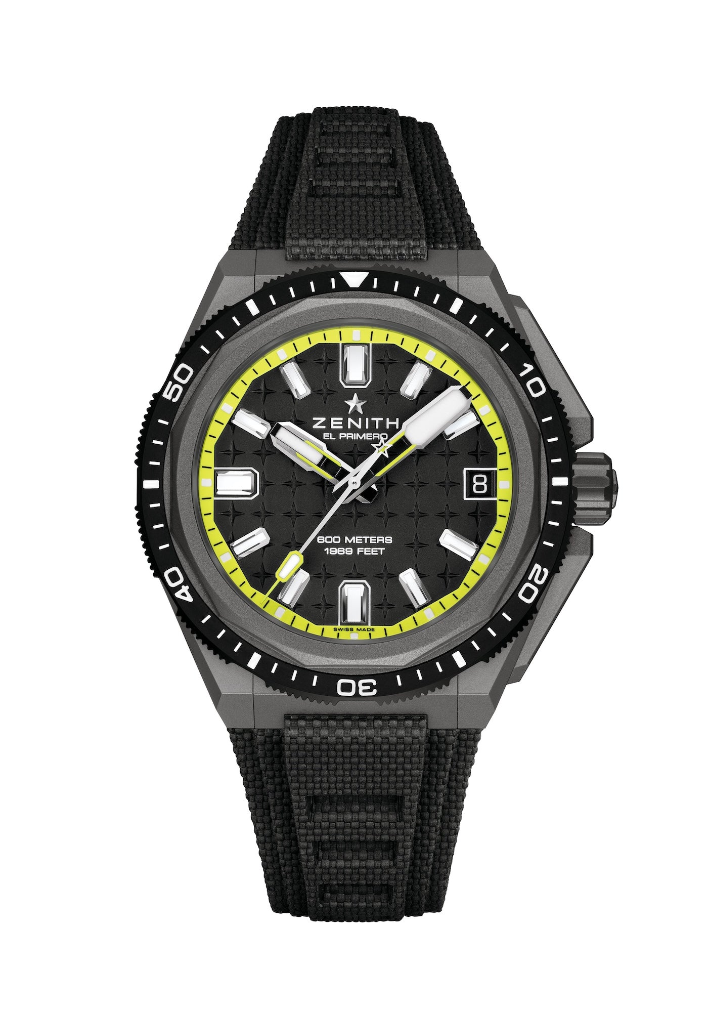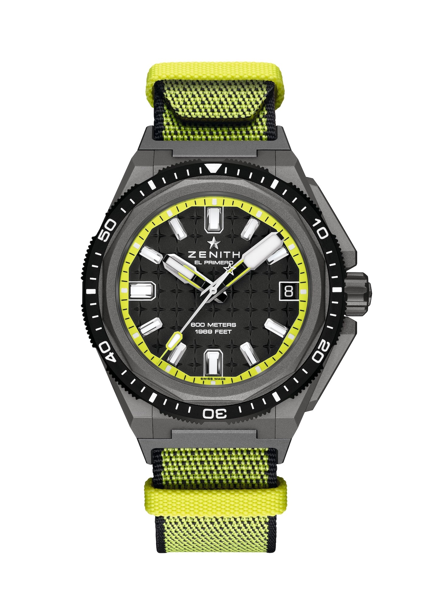 Completing the Defy Extreme Diver is its titanium three-link bracelet as well as two supplied straps. The first additional strap is in FKM rubber, matching the dial colour with a Cordura-effect texture that features vents on the side, allowing water to pass through. In line with Zenith's HORIZ-ON initiative to reduce the brand’s environmental impact and produce more sustainably, the Defy Extreme Diver also comes with an extra-long strap made of recycled fishing nets, intended to be worn over a wetsuit. It features specific end-pieces to pass the single-piece strap through and under the case for a secure fit.