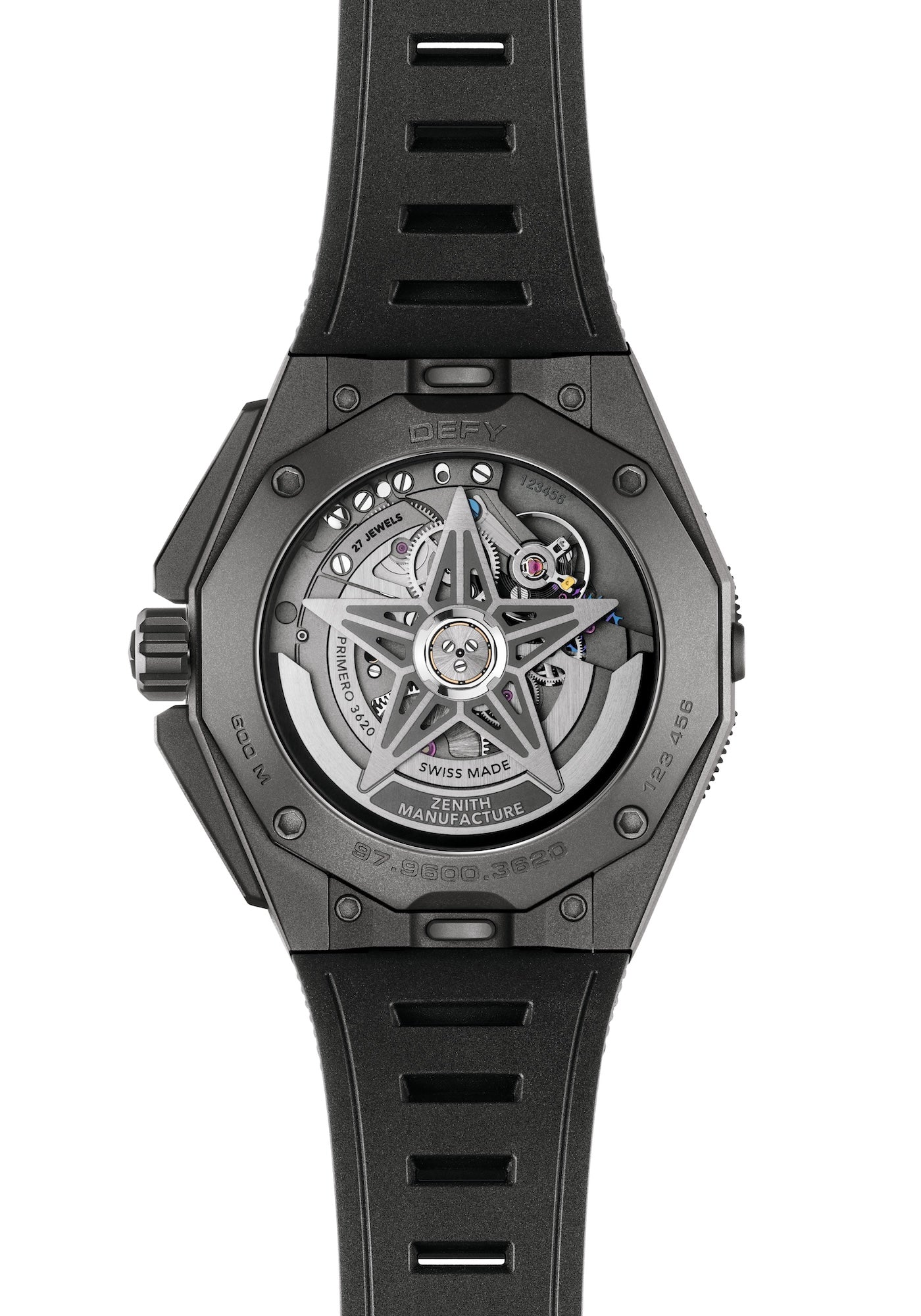 The Defy Extreme Diver is powered by the El Primero 3620-SC automatic high-frequency manufacture calibre with 60 hours power reserve, visible through a sapphire display back – an uncommon feature among diver’s watches. This version of El Primero features a paramagnetic escapement with key components in non-metallic silicon.