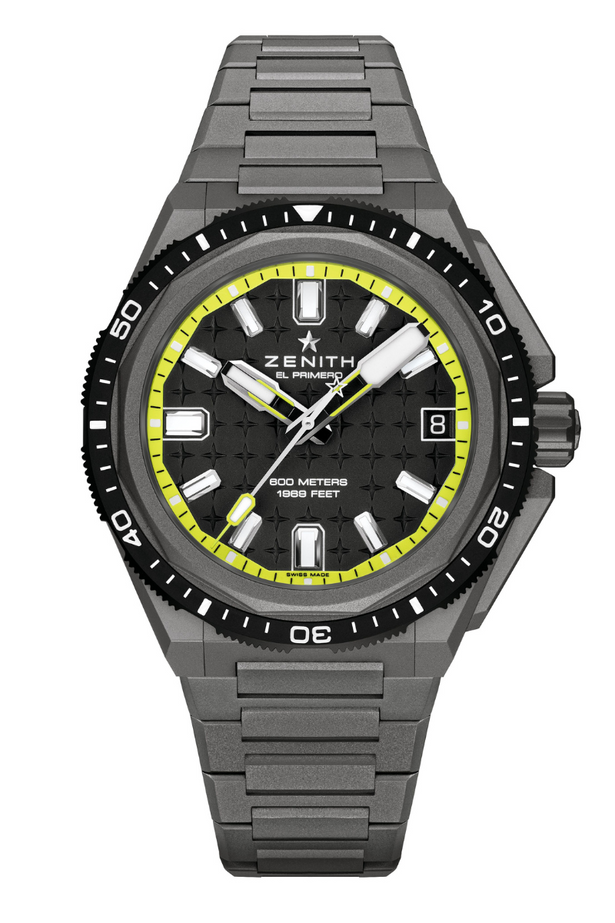 While inspired by a long line of Defy divers from 1969 onwards, the Zenith Defy Extreme Diver is as modern as they come. Its singular and highly intricate design serve to enhance its depth-defying performance, which was conceived to take on extreme conditions where ice, water and mist present a host of challenges. Its 42.5mm angular case is crafted in matte, microblasted titanium, a metal that not only boasts a significant weight-to-strength ratio but is also highly resistant to corrosion from salty seawater. The case is equipped with a helium escape valve for saturation diving. Above the fixed dodecagonal bezel, the ceramic unidirectional rotating bezel features grooved edges for a better grip when operating – even with gloves on. The bezel is engraved and filled with Super-LumiNova and bright colors for effortless reading underwater where light is scarce.