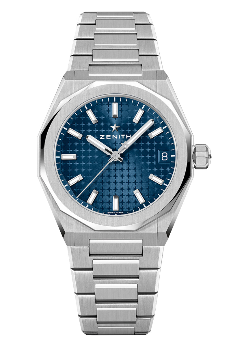 The Zenith Defy Skyline in a mid-size 36mm version keeps the angular shape of the original while introducing more modest, unisex proportions that perfectly fit those who prefer a smaller fit. It is crafted in an octagonal steel case with a faceted bezel, featuring the Manufacture’ first patterned dial revisiting the emblematic four-pointed star found in past Zenith references.